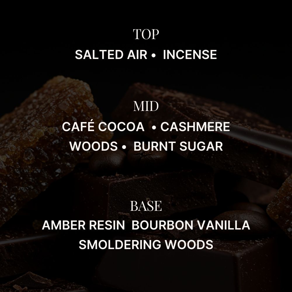 The One opens with a breath of salted air and a flicker of incense. Café cocoa and burnt sugar swirl softly with vanilla and amber, grounded by smoldering woods and cashmere warmth.
